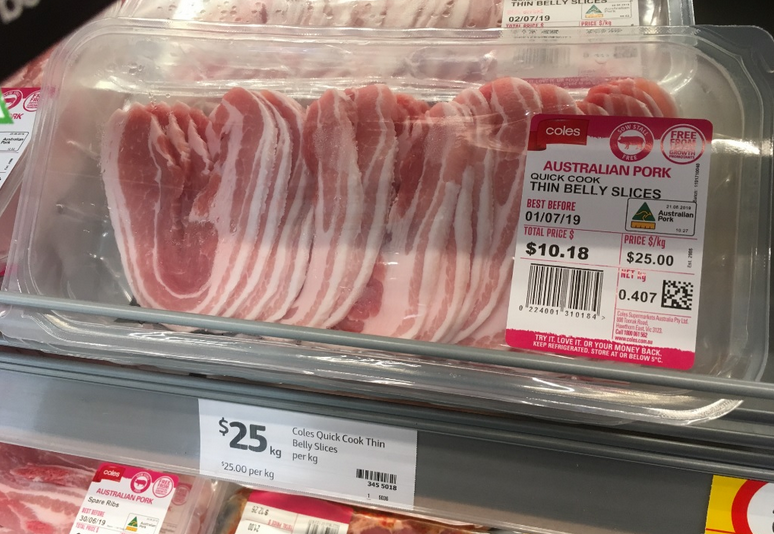 コールズで販売が始まった薄切り豚肉。誰かがコールズに「薄切りにすれば、アジア人に売れるよ」とささやいたのだろうか。