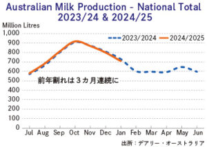 ニュージーランド(NZ)の1月の牛乳生産量は乳固形分ベースで前年同月比5%増の2億1,185万キログラムだった。ニュージーランド証券取引所(NZX)の予想の0.8%増を大きく上回り、1月の生産量としては2021年以降で最高を記録した。ファーマーズ・ウイークリーが伝えた。
