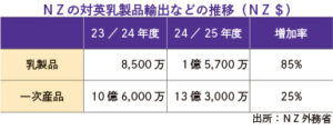 NZ酪農、輸出は横ばい見通しも成長余地 2026年1月23日 最終更新日時 : 2026年1月23日 ウェルス編集部 ニュージーランド(NZ)の乳製品輸出は当面横ばいとなる見通しだ。第1次産業省(MPI)が先に発表した「第1次産業の状況と見通し(SOPI)」によると、2025/26年度(25年7月-26年6月)の輸出額は前年度比1%増にとどまる。一方で政府は、酪農業自体には引き続き成長余地があるとの認識を示している。デアリーニュースが伝えた。 コンテンツの残りを閲覧するにはログインが必要です。 お願い Log In. あなたは会員ですか ? 会員についてFacebookXBluesky