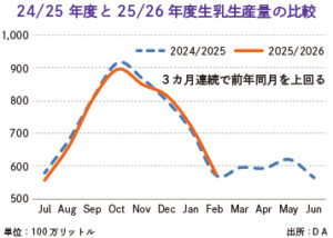 ニュージーランド(NZ)の2月の集乳量は乳固形分ベースで1億8,380万キログラムとなり、月間の過去最高を記録した。NZ証券取引所(NZX)によると、前年同月比では7.4%増、過去5年平均も7.6%上回った。3月と4月も4-5%台の増産が続くとみられている。
