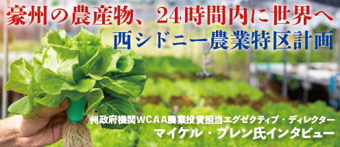 豪州の農産物、24時間内に世界へ 西シドニー農業特区計画 2020年1月10日 最終更新日時 : 2022年4月28日 ウェルス編集部 州政府機関WCAA農業投資担当エグゼクティブ・ディレクター マイケル・ブレン氏インタビュー 2026年、シドニー中心部から西に約50キロの地域に西シドニー国際(ナンシー・バード・ウォルトン)空港がオープンする。 コンテンツの残りを閲覧するにはログインが必要です。 お願い Log In. あなたは会員ですか ? 会員についてFacebookXBluesky