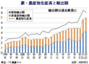 豪の穀物絶好調、豊作3年目へ 多雨で恩恵 2022年9月9日 最終更新日時 : 2022年9月9日 ウェルス編集部 オーストラリア農業資源経済・科学局(ABARES)は6日、2022/23年度(22年7月ー23年6月)の冬作物の生産量が5,550万トンに達し、4位の豊作になると予想した。また夏作物は、作付面積が155万ヘクタール(ha)に上り、生産量は過去5番目に多い520万トンと見込む。過去最高だった前年からは後退するものの、雨の多い気候条件に支えられ、穀物生産は好調な3年目を迎える。【ウェルス編集部】 コンテンツの残りを閲覧するにはログインが必要です。 お願い Log In. あなたは会員ですか ? 会員についてFacebookXBluesky