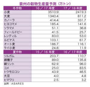 オーストラリア農業資源経済・科学局(ABARES)が14日発表した最新の四半期穀物リポートで、2017/18年度(17年7月~18年6月)の小麦などの冬作物の生産量が約4,010万トンと前年度から33%減少するとの予想を示した。